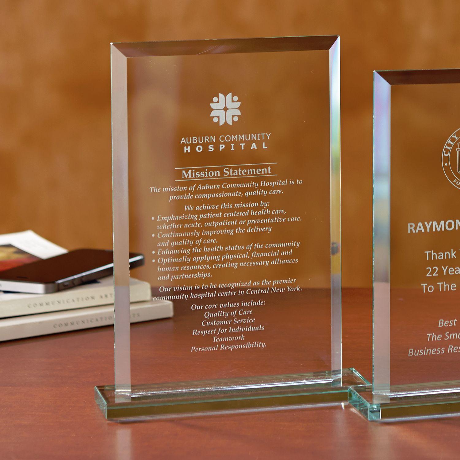 This beveled glass award has outstanding imprint area framed beautifully by beveled edges to keep the focus on your etched imprint. 6.3125″ W x 8.5″ H x 1.8125″ D