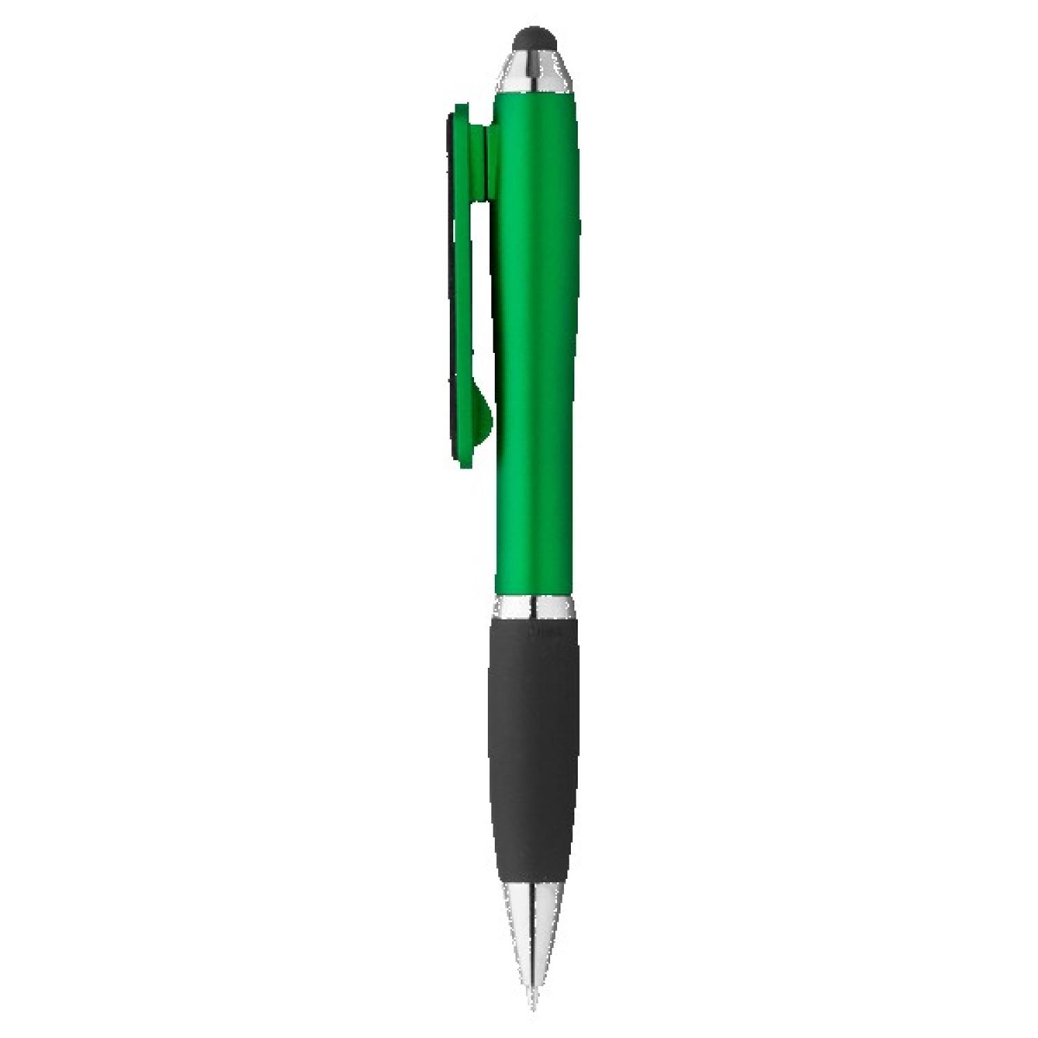 Twist-action ballpoint pen. Curvaceous satin metallic barrel, rubberized black comfort grip, shiny silver accents, and screen cleaner clip. Capacitive stylus tip. Black ballpoint ink. 5.25″ D