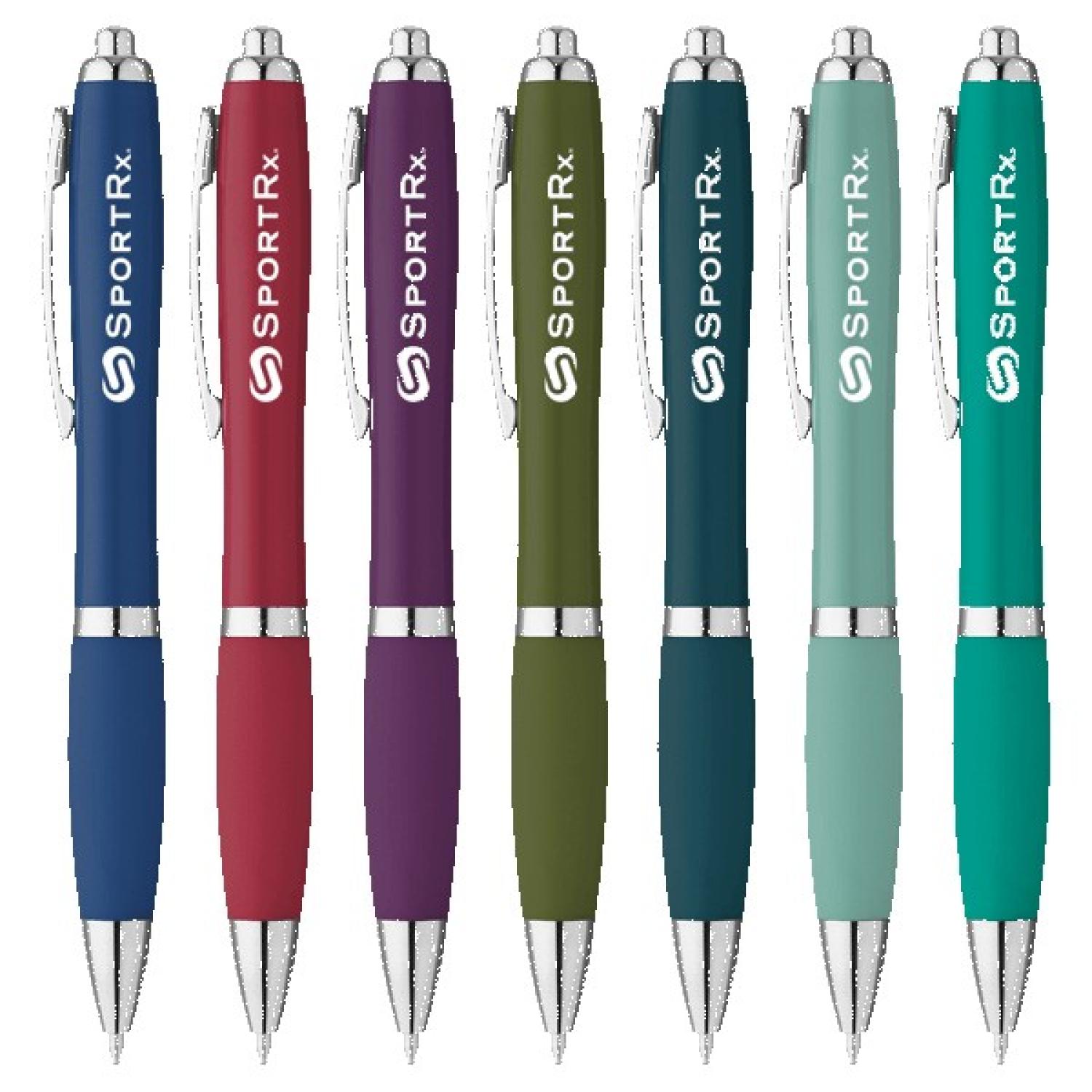 Plunge-action ballpoint pen with matte curvy plastic barrel and matching rubberized finish grip. Features shiny chrome accents and split metal clip. Black ballpoint ink. 5.5″ D x 0.5″ W