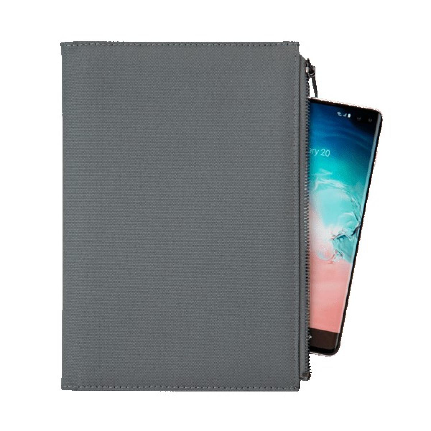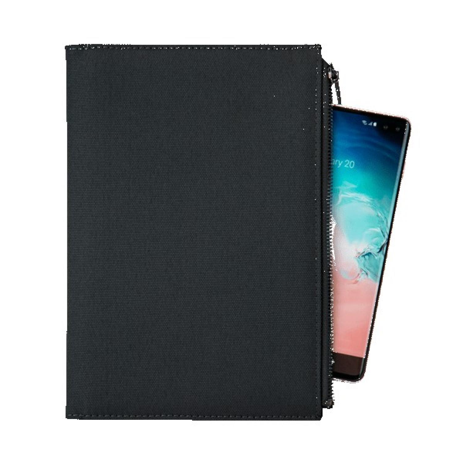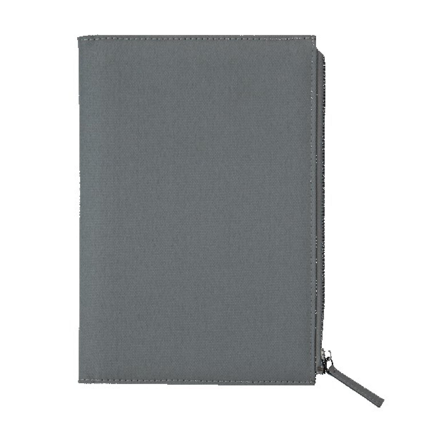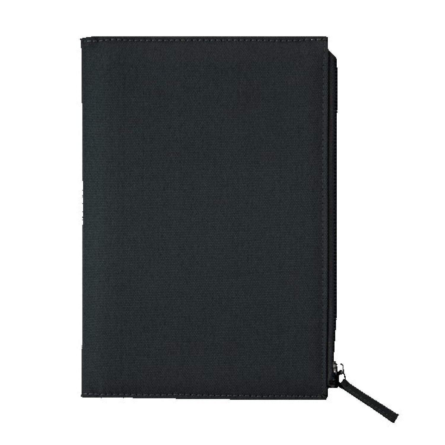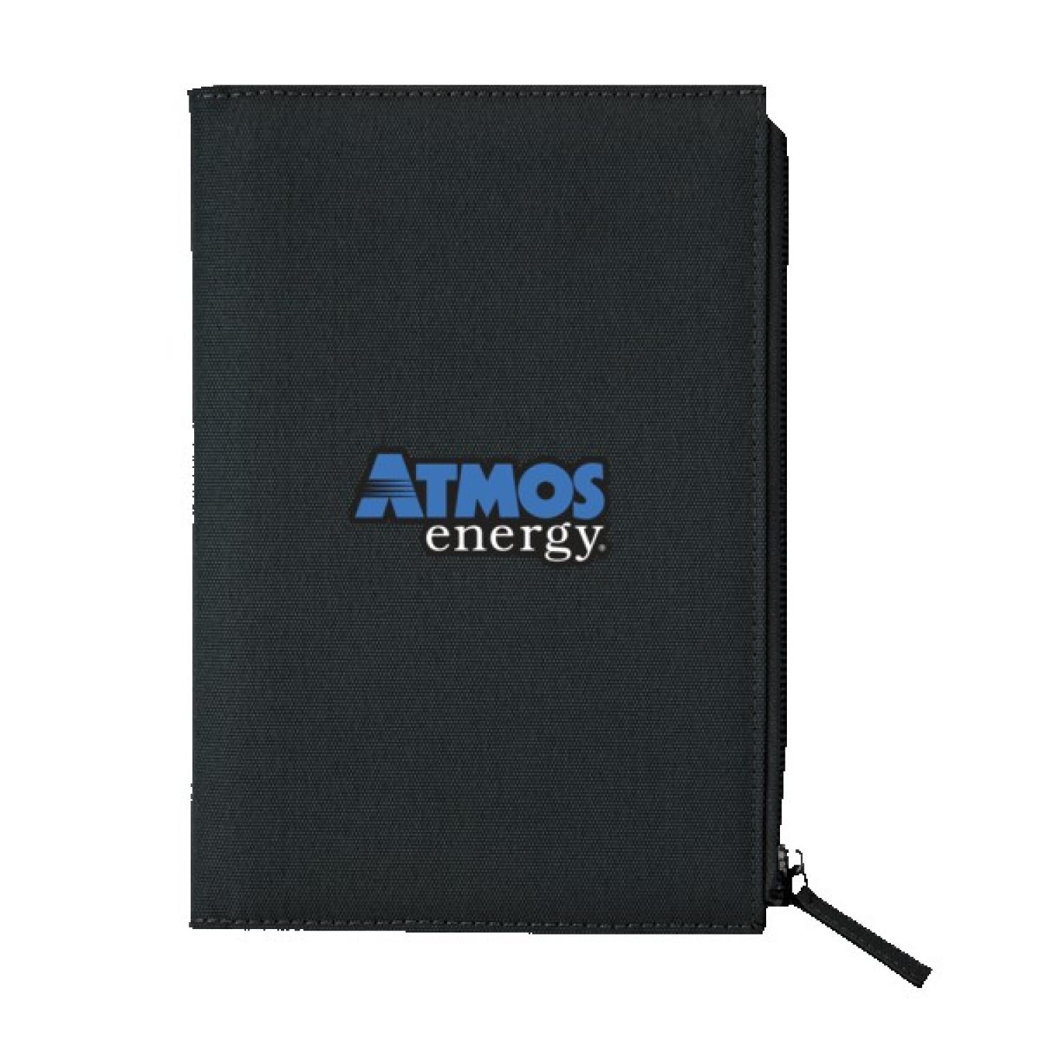 Durable 600D notebook with large front zipper pocket. Includes a replaceable perfect bound hardcover 80 sheet lined notebook with date fill-in section and color matched elastic pen loop. 8.625″ H x 5″ W