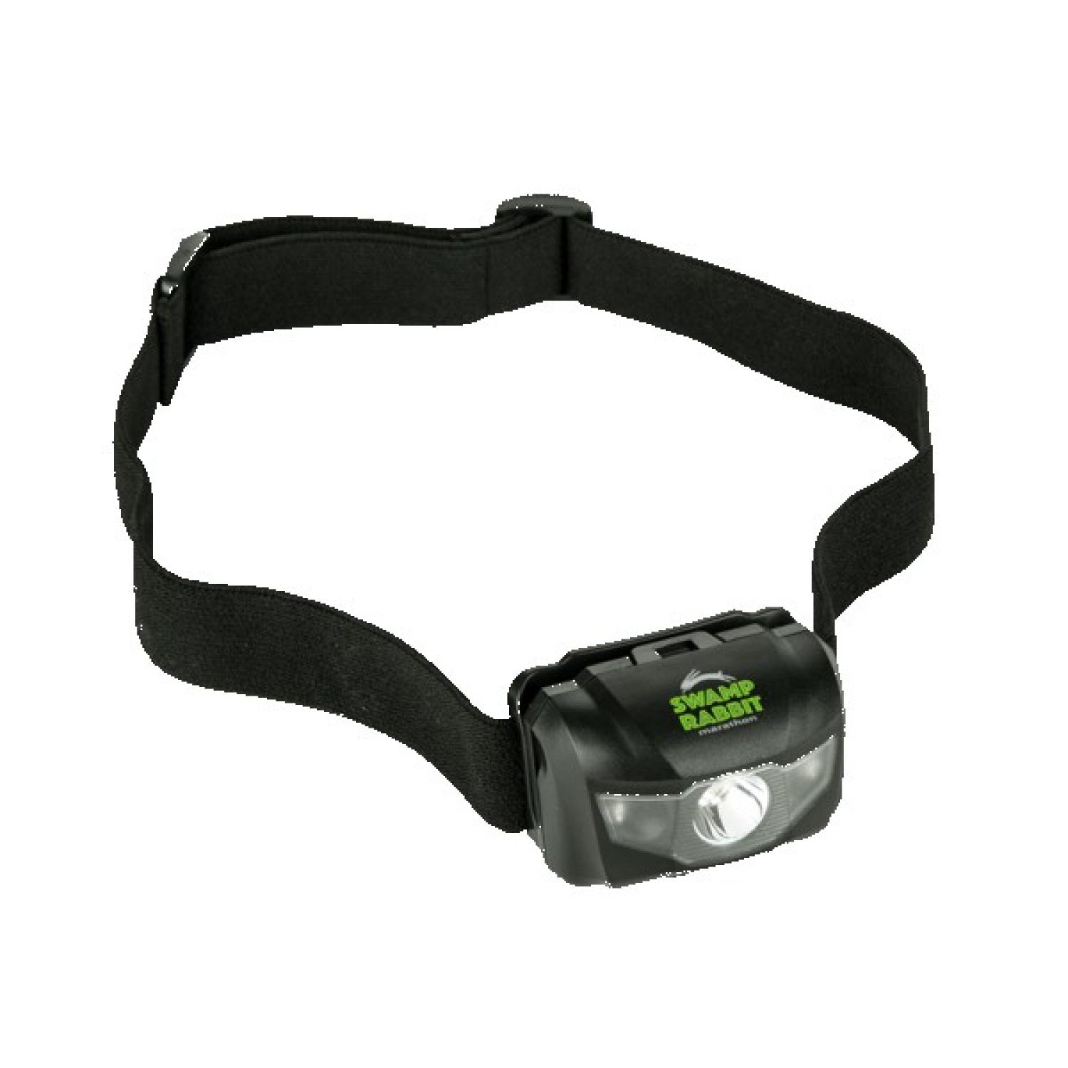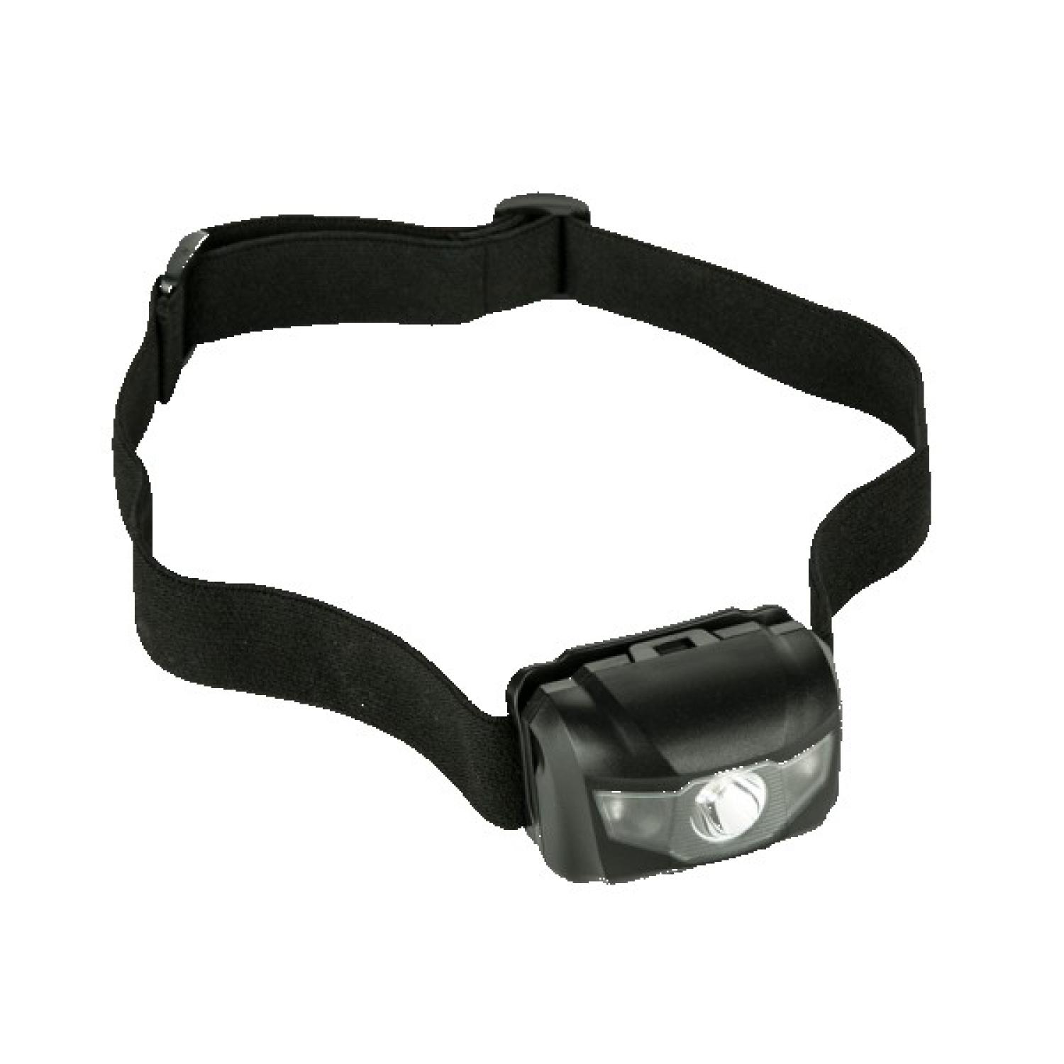 Adjustable LED headlamp with four lights modes (white solid, white dim, red sold, red flashing). Features angled head and adjustable elastic strap. 110 lumen output. Requires 3 AAA batteries (included). 1.578125″ H x 2.375″ W