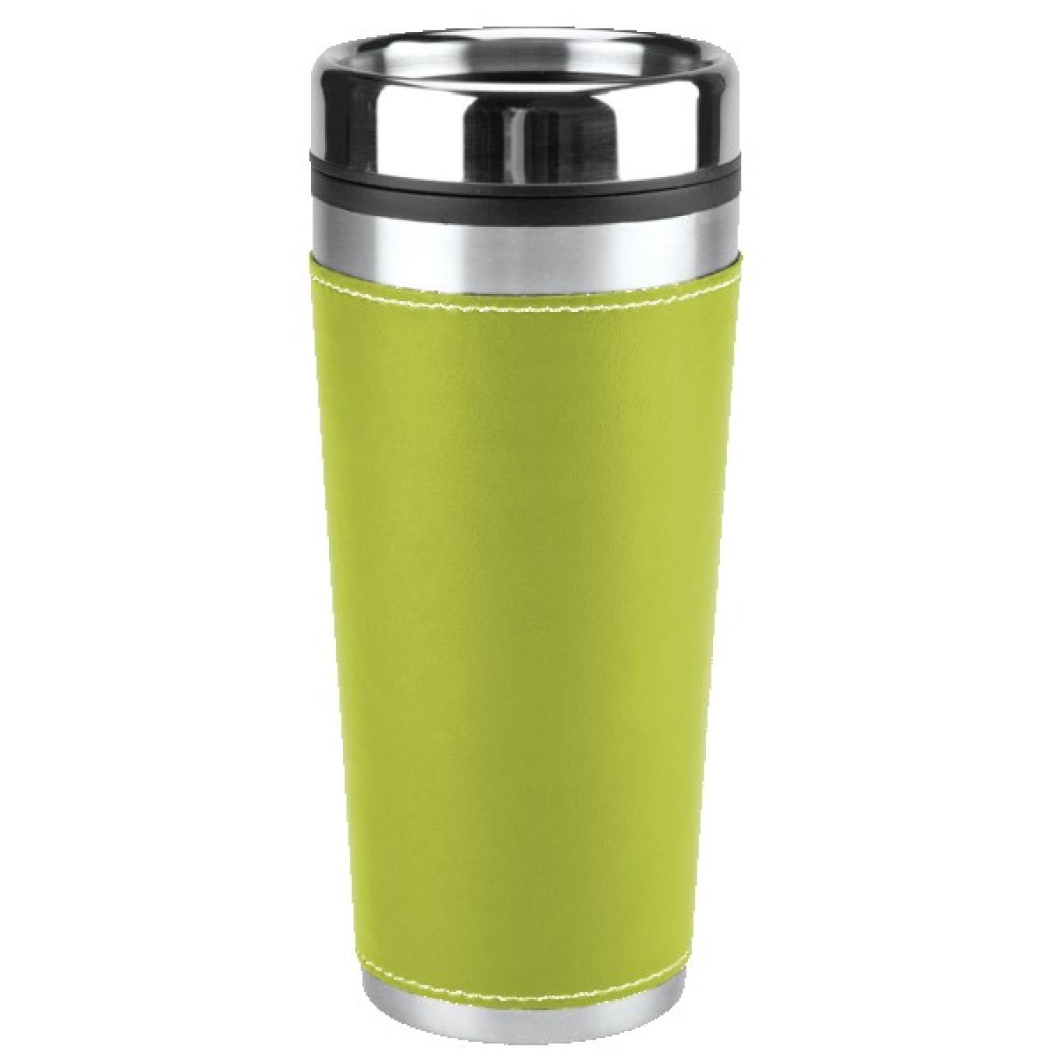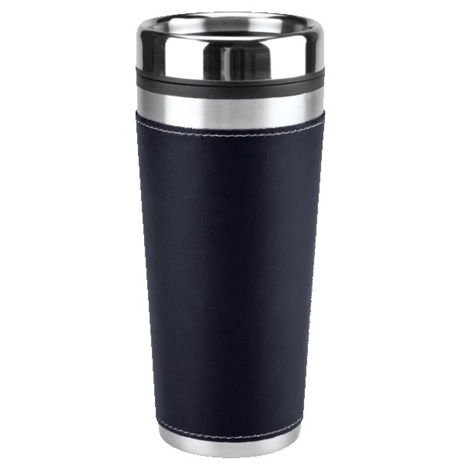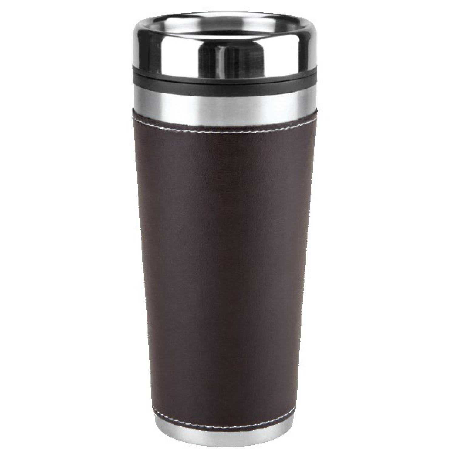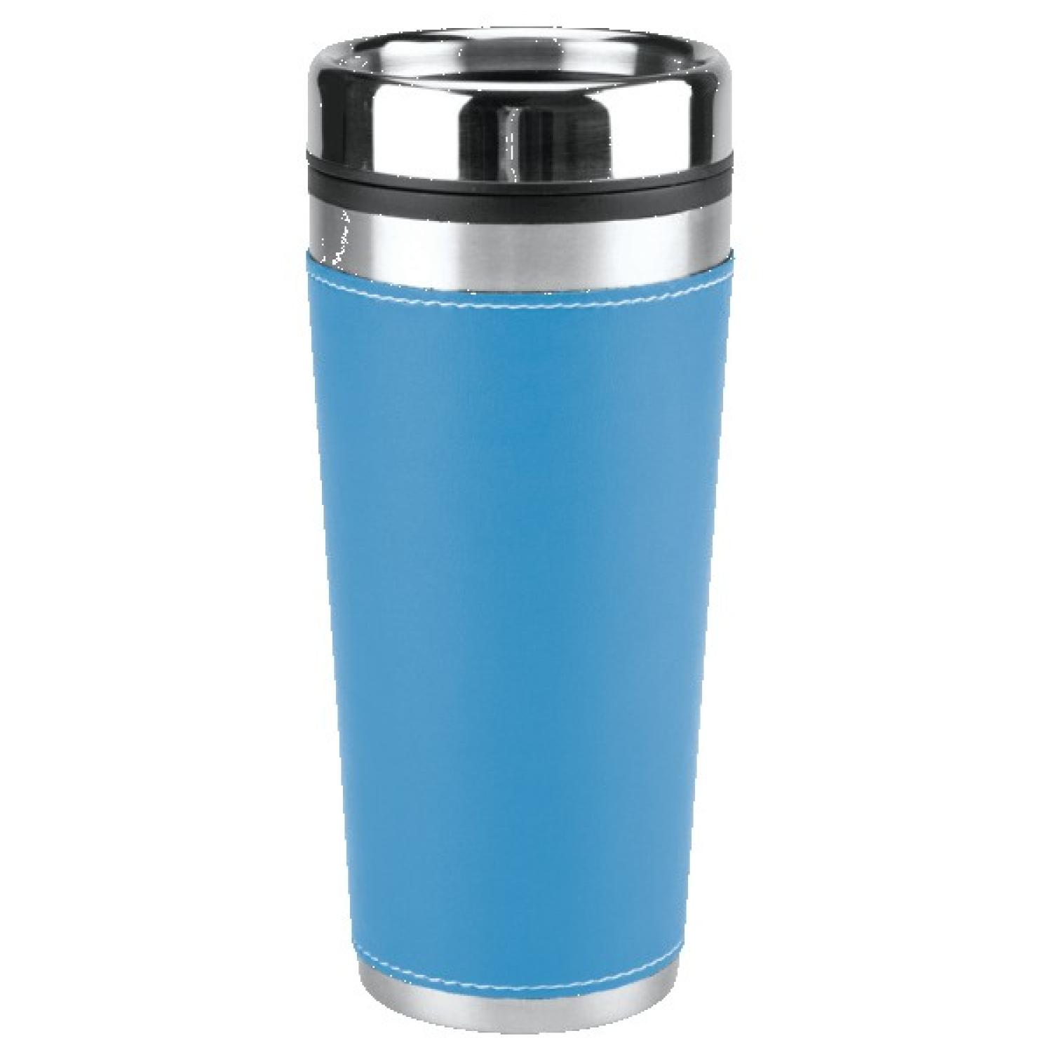 16 Oz. Stainless steel outer wall with plastic liner; full PVC sleeve with white stitching; double wall insulation; stainless steel lid with slide lock prevents spills. Non-slip bottom. Not microwave or dishwasher safe. Complies with FDA. 8″ H x 3.125″ W
