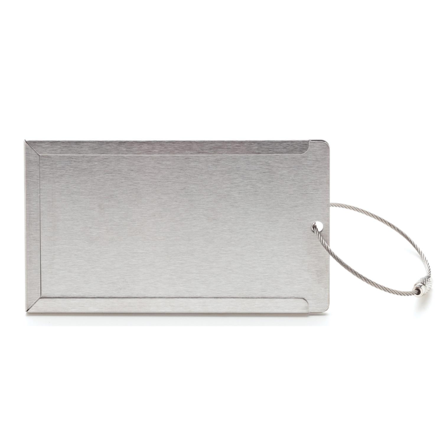 Brushed steel luggage tag / business card holder with steel cable closure. Complies with Prop 65. 4″ W x 2 1/4″ H x 1/8″ D