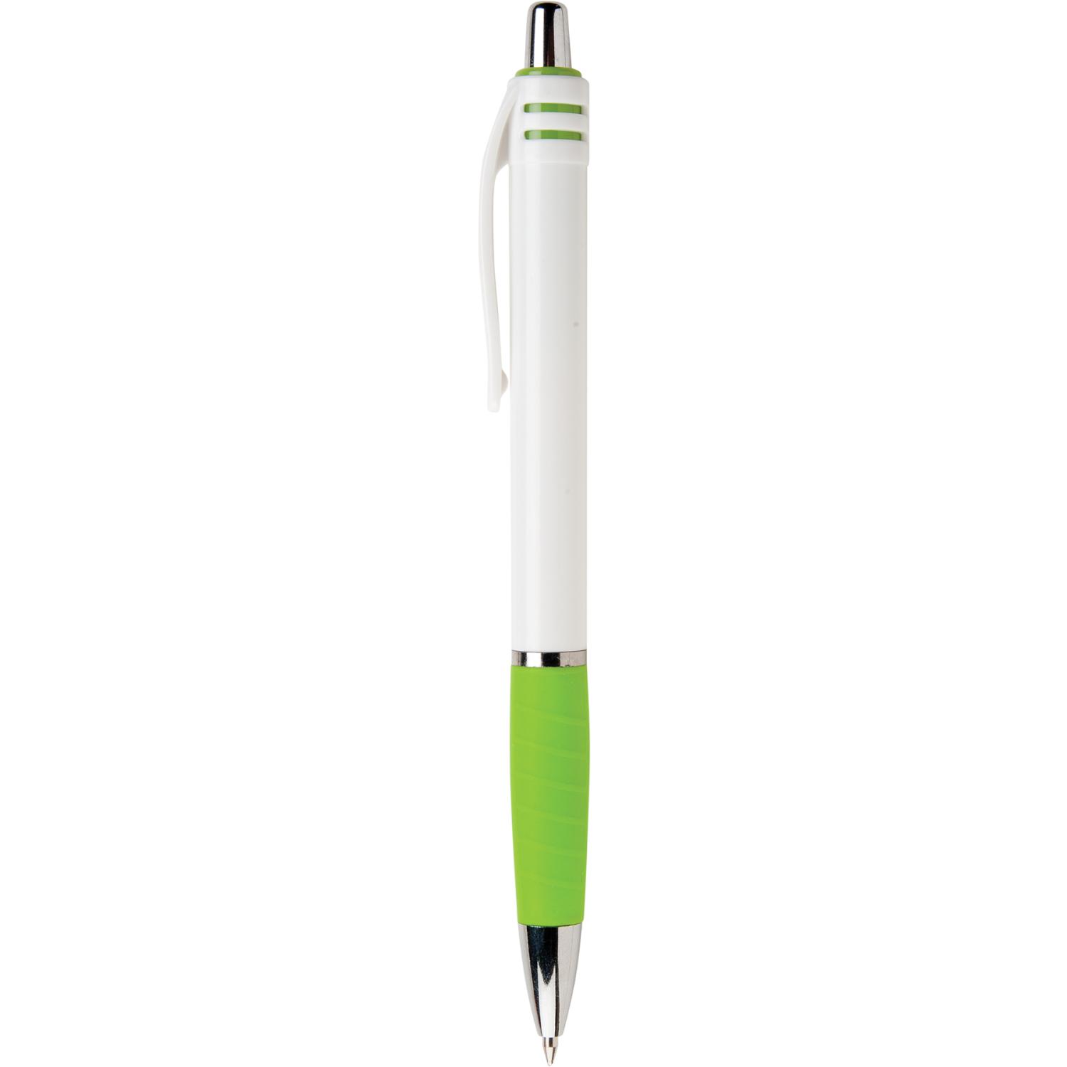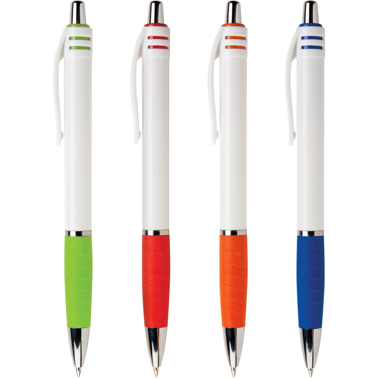 Crisp white barrels with contemporary styled trim in vivid brights & chrome. Ribbed pillow grip for writing comfort. Smooth writing black ink. Complies with Prop 65. 5.57″ L x 0.41″ Diameter