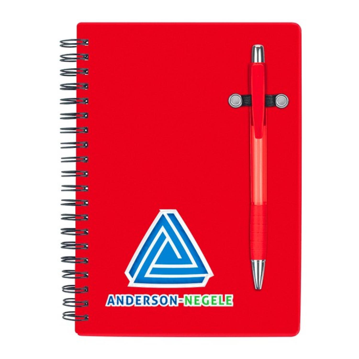 Spiral bound 70-sheet lined notebook; bright translucent color cover; matching translucent color pen. 7″ H x 5″ W