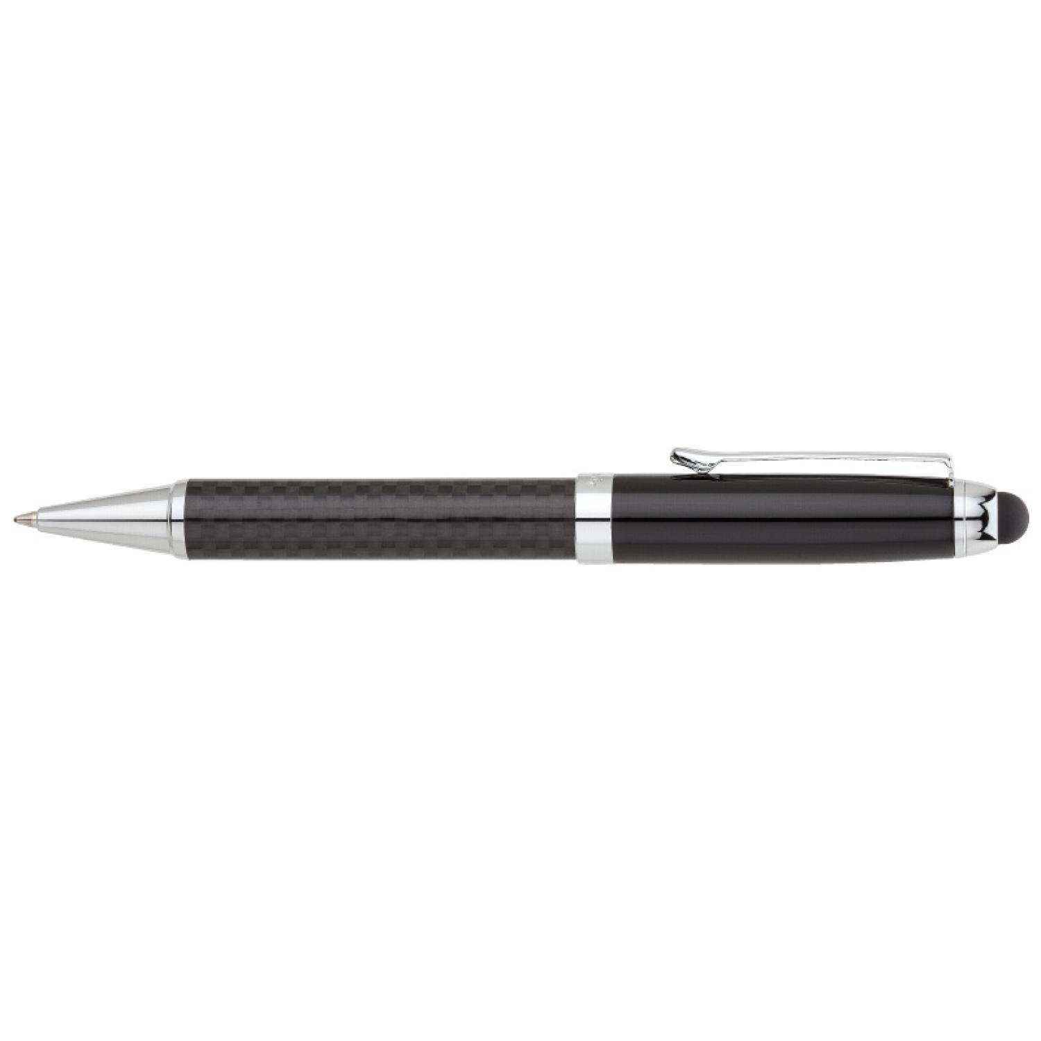 Brass twist-action Bettoni pen with carbon fiber barrel, chrome trims, and capacitive stylus that works with touch screen devices. Complies with Prop 65. 3/4″ W x 5 3/4″ H x 1/2″ D