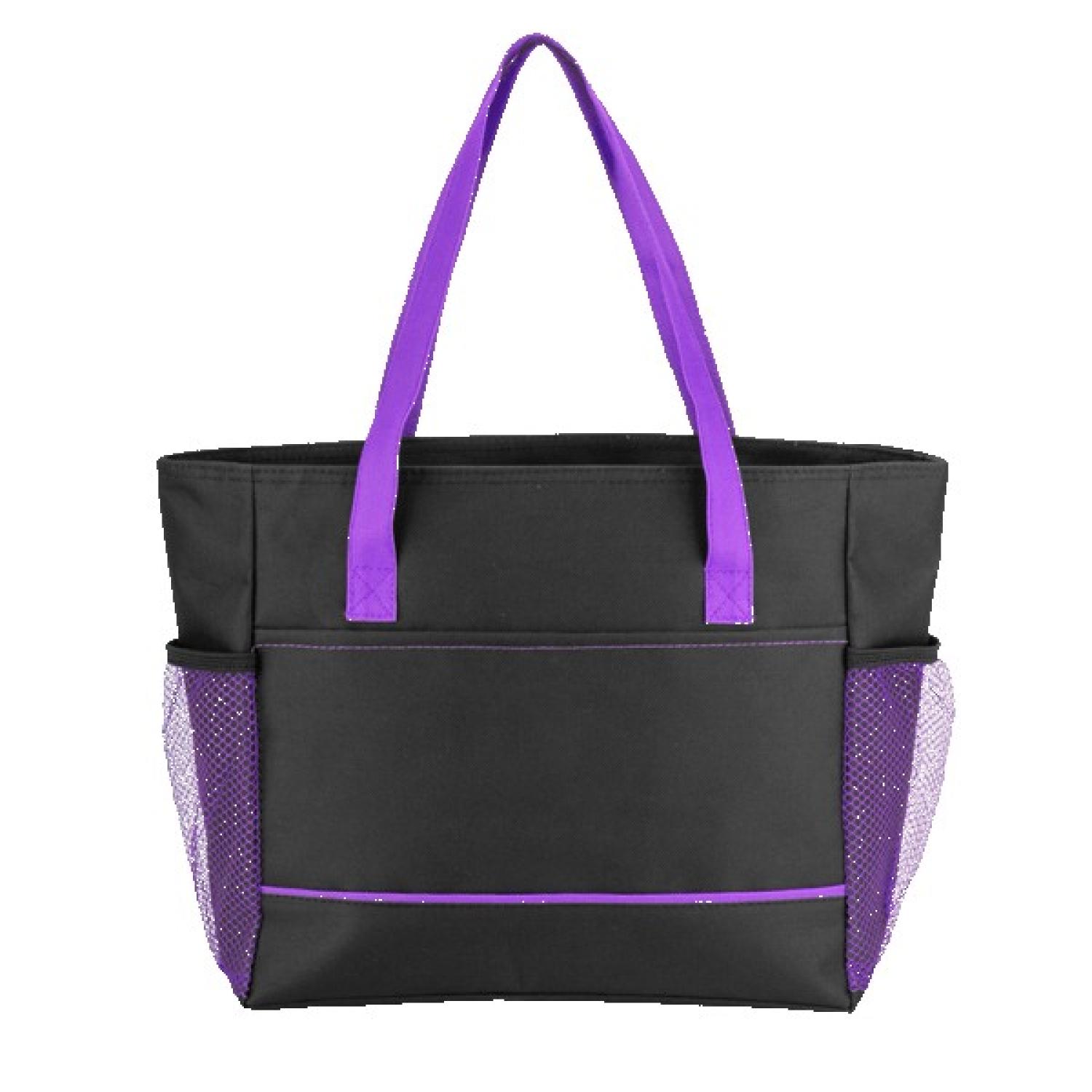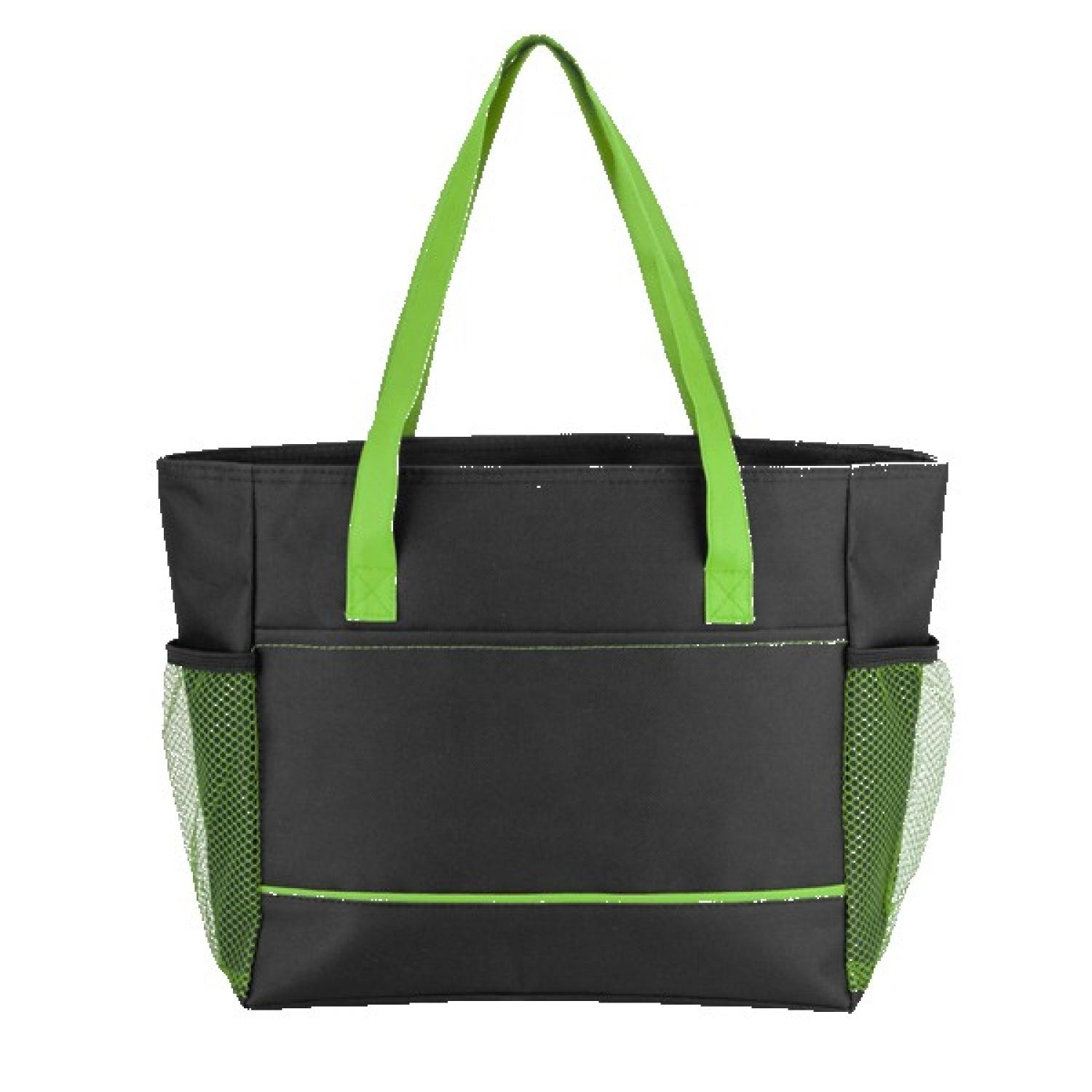 Black 600D polyester cooler tote with bold color accents. Top zip-main compartment holds up to 16 cans and stays insulated with heat sealed PEVA lining. Double side mesh pockets; double handle straps; and contrast detailing. 12″ D x 10″ H x 5″ W