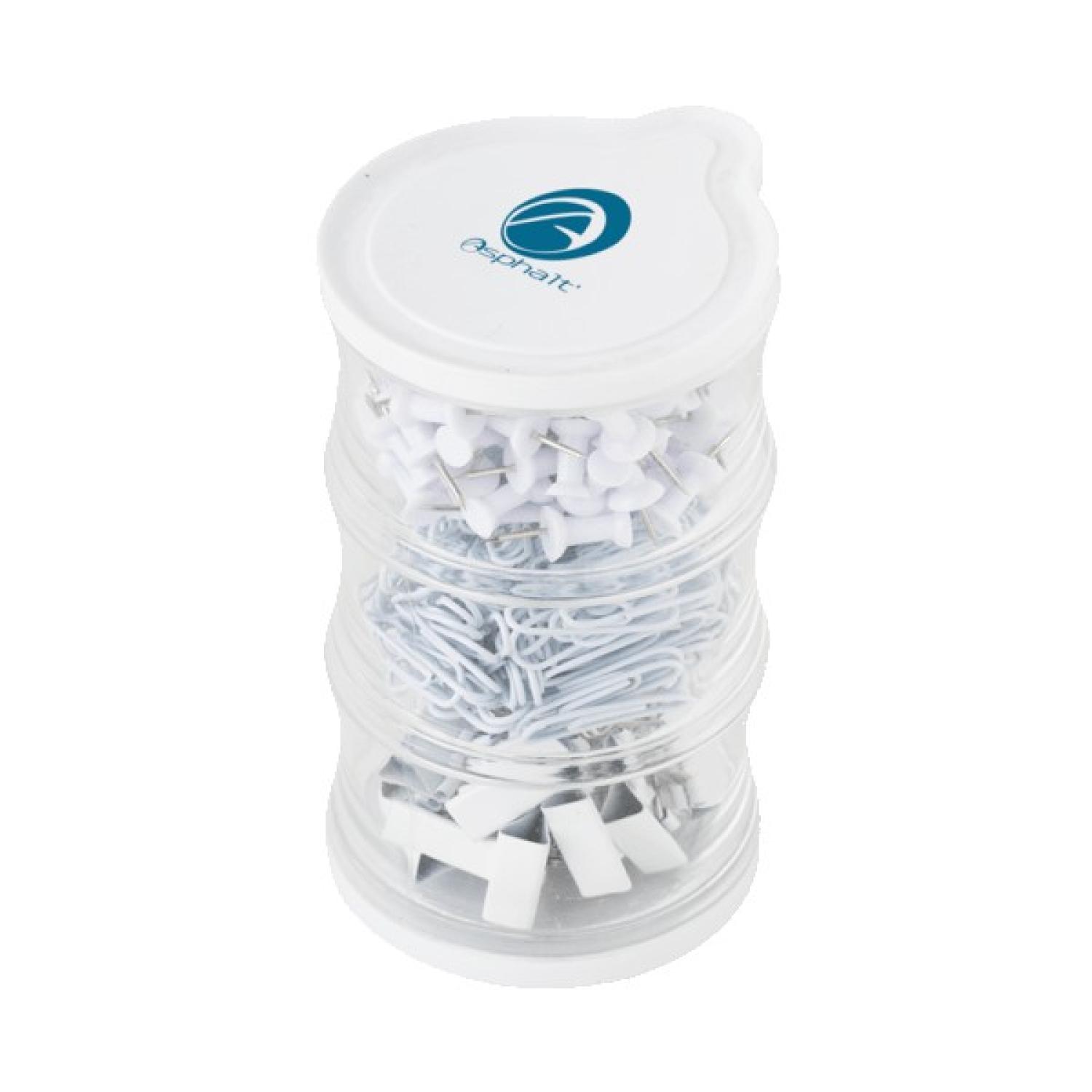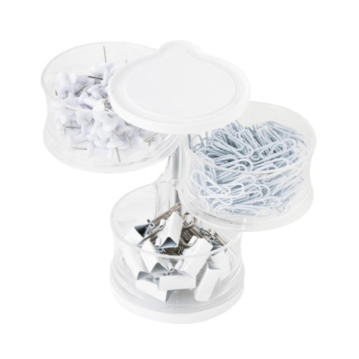 Three tier, swivel open tower desk organizer. Color matching lid and base with clear compartments. Comes with color matched 19mm binder clips (14 pieces), push pins (90 pieces), and 28mm paper clips (120 pieces). 4.75″ H x 3.125″ W